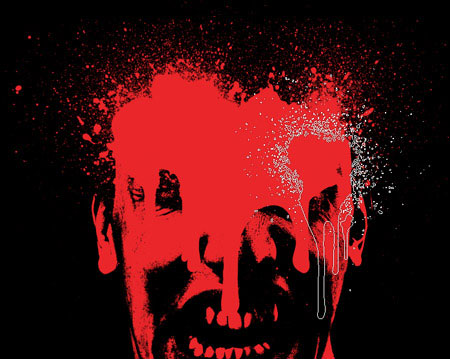 Вместо аккуратных линий волос на голове зомби, мы добавим несколько окровавленных брызг. Создайте новый слой поверх слоя ‘зомби’. С помощью кисти, нарисуйте различного рода брызги, как показано на скриншоте ниже. Только не переусердствуйте, постарайтесь не закрашивать черты лица зомби, обратите больше внимания на рисунок капель и брызг.