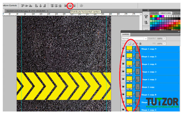 Удерживая Ctrl, кликаем поочередно по всем слоям со стрелками, чтобы выделить их. Далее жмем на кнопку Distribute Horizontal Centers (Выравнивание центров по горизонтали).