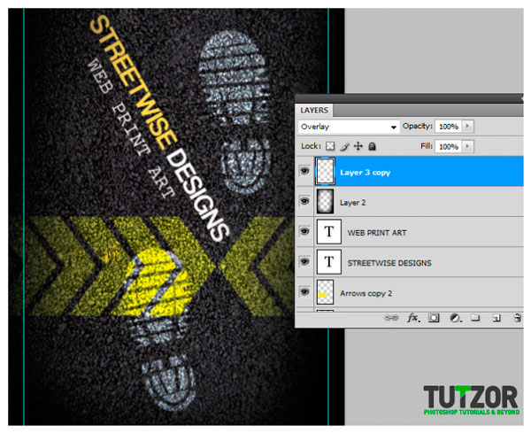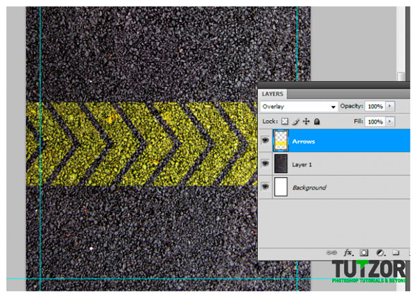Объединяем все слои со стрелками в один и устанавливаем режим наложения новоиспеченного слоя на Overlay (Перекрытие), это создаст эффект, будто стрелки правда нарисованы на асфальте.