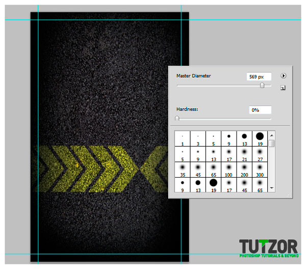 Отлично. Теперь добавим разметку на наш асфальт. С помощью встроенных форм в фотошопе, создаем желтую стрелку, как показано ниже.