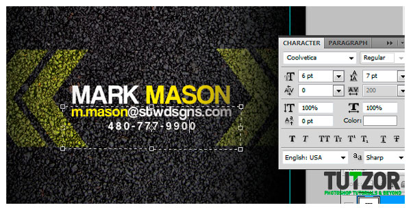 Теперь добавим текст на лицевую сторону визитки. Размещаем текст под углом, как я, чтобы создать интересный эффект.