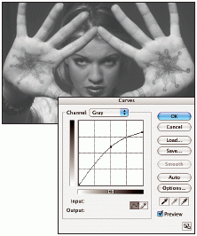 Выберите Image > Adjustments > Curves (Изображение - Коррекция - Кривые). Постарайтесь изобразить такую же кривую и нажмите ОК.