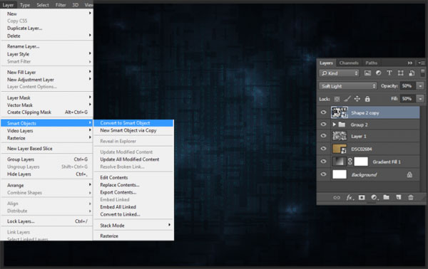 Преобразуйте слой с фигурой в Смарт-объект, для этого, щёлкните правой кнопкой мыши по слою и в появившемся окне выберите опцию Преобразовать в Смарт-объект (Convert to Smart Object) или перейдите Слой - Смарт-объект – Преобразовать в смарт-объект (Layer > Smart Objects > Convert to Smart Object), а также поменяйте режим наложения для слоя с фигурой на Мягкий свет (Soft Light), Непрозрачность (Opacity) слоя: 50%, Заливка (Fill): 50%.