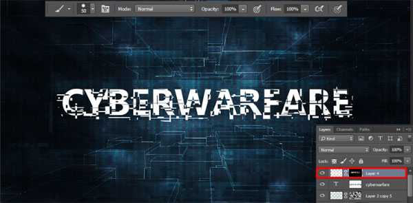 Загрузите активное выделение текста (удерживая клавишу “Ctrl”+щёлкните по миниатюре слоя с текстом ), далее, проведите инверсию активного выделения (Ctrl + Shift + I) или перейдите Выделение – Инверсия (Select > Inverse). Переходим на слой-маску слоя с фигурой и с помощью жёсткой круглой кисти (непрозрачность (Opacity) кисти: 100%, цвет кисти: чёрный) удалите все лишние участки фигуры за исключением фрагментов, подходящих к тексту. Также удалите линии в пределах контура текста (ещё раз проведите инверсию активного выделения). Здесь главное проявить креативность. Попробуйте подойти творчески к созданию данного эффекта :). Чтобы отменить активное выделение, перейдите Выделение – Отменить выделение (Select > Deselect) или нажмите клавиши (Ctrl + D).