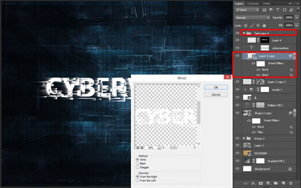 Теперь, выделите оба слоя, продублируйте их (для этого нажмите (Ctrl + J) или перейдите Слой - Создать дубликат слоя… (layer > Duplicate layer…)), а затем объедините дубликаты слоёв в один слой. Для этого идём Слой - Объединить слои (Layer > Merge Layers…) или нажимаем сочетание клавиш (Ctrl + E). Преобразуйте объёдинённый слой в Смарт-объект, идём Слой - Смарт-объект – Преобразовать в Смарт-объект (Layer > Smart Objects > Convert to Smart Object). Далее, идём Фильтр – Стилизация – Ветер (Filter > Stylize > Wind). Установите Метод (Method) Ветер (Wind), а Направление (Direction) Справа (From the Right). Далее, ещё раз примените этот же фильтр (Ctrl + F) или идём Фильтр – Стилизация – Ветер (Filter > Stylize > Wind). Теперь сместите объёдинённый слой вниз, расположив его ниже двух слоёв с текстом и фигурой. Сгруппируйте полученные три слоя (Ctrl + G) или нажмите кнопку Создать группу (Create a group) в нижней части панели слоев. Уменьшите Заливку (Fill) до 0%.