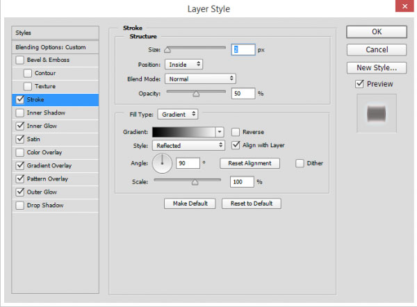 Теперь мы перейдём к добавлению эффектов к тексту. Дважды щёлкните по слою с группой (или нажмите кнопку Добавить стиль слоя (Add a layer style) или перейдите Слой - Стиль слоя – Обводка (Layer > Layer Style > Stroke) и в появившемся окне выберите стиль слоя Обводка (Stroke)). В окне настроек данного стиля слоя, установите Размер (Size): 2 px, Непрозрачность (Opacity):50%, Тип обводки (Fill Type): Градиент (Gradient), установите чёрно-белый градиент, Стиль (style) Зеркальный (Reflected), Угол (Angle): 90 градусов.