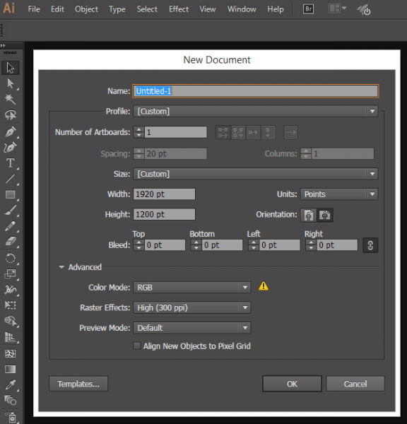 Теперь мы создадим текстуру пиксельного камуфляжа. Я решил, что данная текстура придаст нашей работе интересный и стильный вид. Для создания данной текстуры я использовал программу Adobe Illustrator CC. Если у вас нет программы Illustrator или вы не хотите тратить на это время, просто выберите интересную текстуру с фигурами из набора и перейдите в Шаг 12. В течение следующих нескольких шагов я покажу вам, как создать интересные абстрактные фигуры в программе Illustrator. Откройте программу Adobe Illustrator, создайте новый документ со следующими размерами Ширина (Width): 1920, Высота (Height): 1200, Растровые эффекты (Raster Effects): 300 ppi.