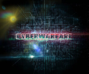 (Horizontal Type Tool (T)), установите шрифт “Ebrima Bold” (данный шрифт должен входить в стандартный набор шрифтов программы Photoshop), размер шрифта: 62.34 pt, цвет шрифта белый. В окне настроек шрифта Символ (Character) (если данная закладка не видна в палитре слоёв, то идём Окно – Символ (Window > Character)), установите режим Все прописные (All Caps). Напечатайте любое слова. В моём случае, я написал слово “cyberwarfare”. Расположите слово по центру изображения между двумя абстрактными металлическими каркасами.
