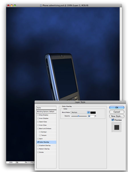 Двойной клик на слое, чтобы войти в установки стилей слоя и примените следующие стили слоя: Color Overlay (Color - black, Blend mode -Multiply,Opacity = 46%), Наложение цвета (Цвет – черный, Режим - Умножения, Непрозрачность =46%)