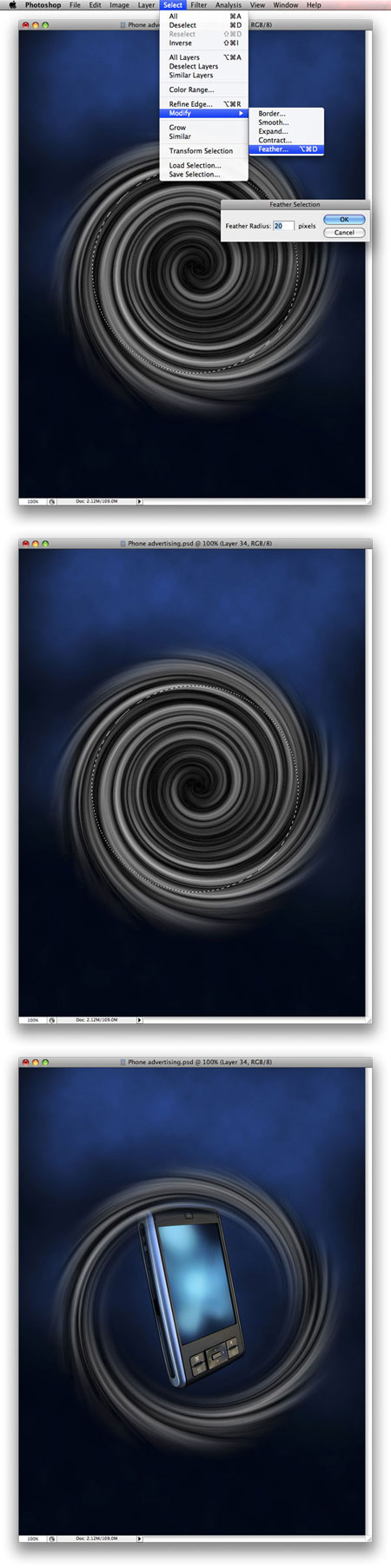 Теперь Вы можете снять выделение и выбрать инструмент Elliptical Marquee Tool (Овальная область (М)) и создать выделенную область, как на рисунке. После этого идем в Select - Modify - Feather (Выделение - Модификация – Растушевка) и используем 20%-ый радиус растушевки. Далее инвертируйте выделение Ctrl + Shift + I. И, наконец, удалите (сотрите) лишнюю часть нашей воронки.