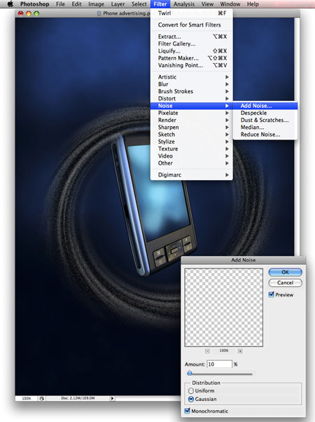 Теперь применяем Filter - Noise - Add noise (Фильтр – Шум - Добавить шум) Gaussian (по Гауссу) с радиусом 10% .