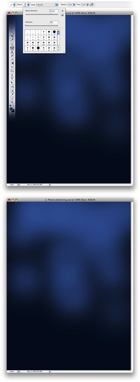Создайте новый слой и назовите его “Пыль”. Теперь выберите кисть и установите ее Hardness (Жесткость) на 0 % и 250 размер. Используйте этот цвет #0b4690 и нарисуйте облако пыли, как показано на экране. Или нарисуйте его по-своему. Установите режим наложения для слоя Screen (Осветление)