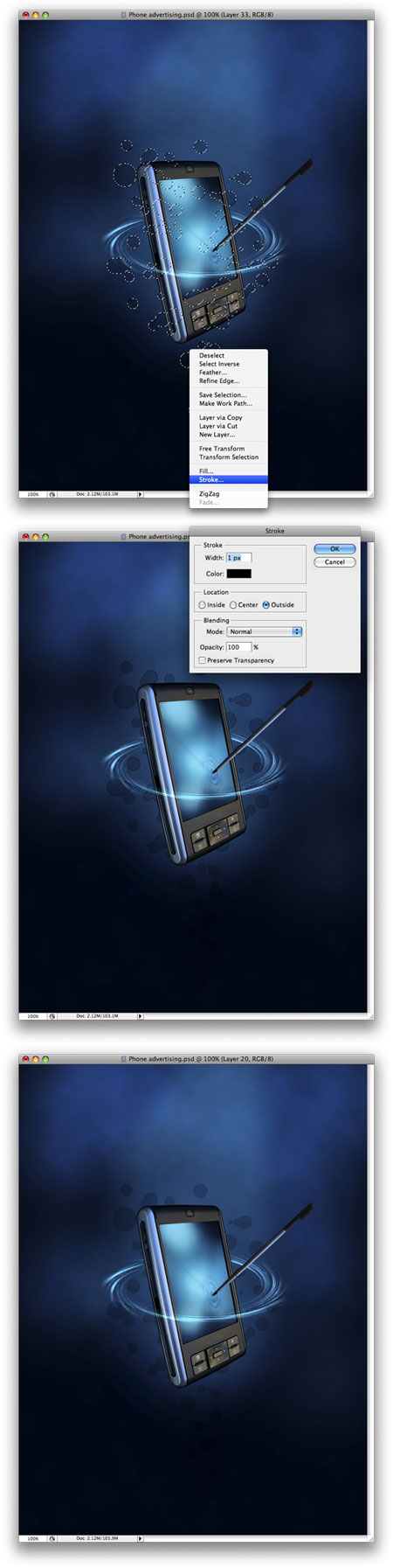 Ctrl + клик на слое, чтобы создать выделение. Теперь создайте новый слой, и выбрав Lasso Tool (инструмент Лассо). Клик правой кнопкой мыши на экране и выбираем select Stroke (выполнить обводку) используйте параметры, как на рисунке. Установите Opacity (непрозрачность слоя) 40 %.