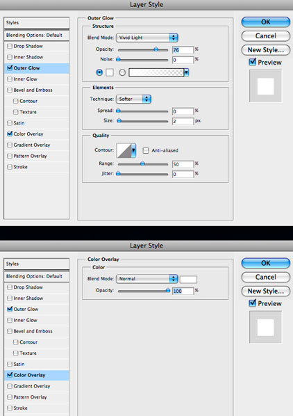 Примените следующие стили слоя для наших пузырьков: Внешнее свечение и Наложение цвета.