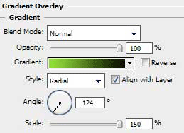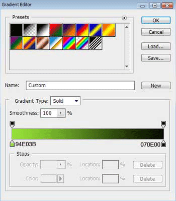 Используйте параметры указанные ниже на картинке, для только что созданного слоя. Blending Options - Gradient Overlay (Режим наложения - Наложение градиента)
