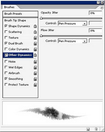 Выберите инструмент кисть, и установите следующие настройки. Сначала – Динамика формы.