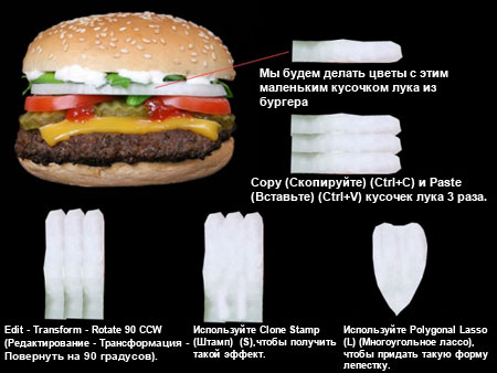 Цветы будут сделаны из маленьких кусочков лука. Нам нужен лишь лепесток, чтобы сформировать цветок. В этом шаге мы научимся делать это, для чего мы снова воспользуемся исходным изображением с гамбургером, представленном во 2 шаге.