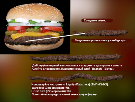 (Многоугольное лассо). Создайте выделение кусочка мяса. Copy (C) (Скопируйте) и Paste (V) (Вставьте). Назовите свой новый слой "Branch" (Ветка). Дублируйте этот слой, чтобы создать копию мяса. Объедините два кусочка вместе. Слейте в новый слой. Не изменяйте имя. Используйте фильтр Liquify (Пластика) и Warp (Деформация)(W). Размер кисти 165. Brush Pressure (нажим кисти) 50. Попытайтесь придать своей ветке такую форму.