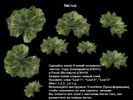 Шаг 8. Сделайте примерно 8 копий основного листочка. Copy (C) (скопируйте) и Paste (Вставьте) (V). Каждая копия должна быть открыта на новом слое. Назовите слои "Leaf1" (Лист 1), "Leaf2" (Лист 2), "Leaf3" (Лист 3) и т.д.