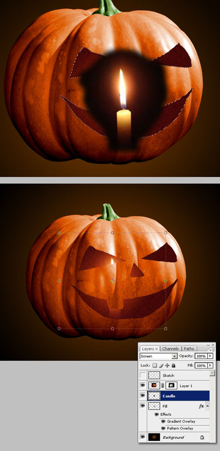 Шаг 9. Теперь добавим свечек. Откройте изображение со свечой, грубо отделите от фона и перенесите в наш документ, назовите слой «свеча», поменяйте режим наложения (Blending Mode) для слоя на Осветление (Screen) и на палитре слоёв расположите под слоем «тыква», дублируйте слой со свечой несколько раз.
