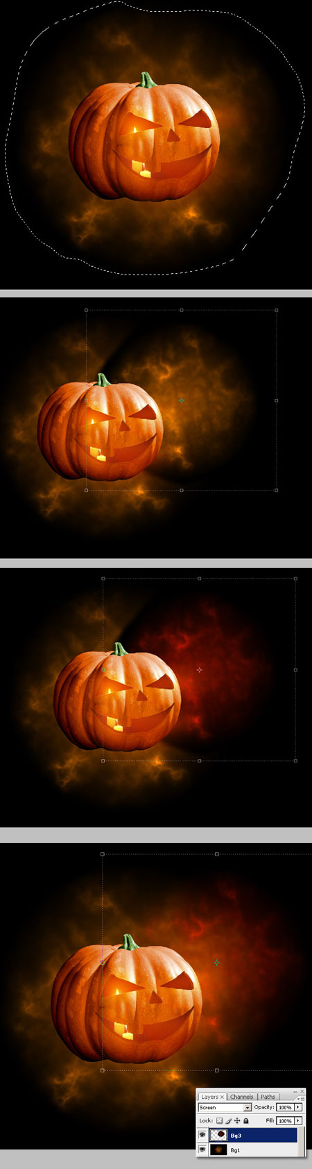 (Lasso Tool), выделите большую область слоя "фон" и скопируйте выделение (Ctrl+J), переместите копию чуть выше и правее тыквы, уменьшите размер (Ctrl+Т) и назовите слой «фон2». Поменяем цвет: Ctrl+U и измените оттенок на красный, поменяйте режим наложения (Blending Mode) для слоя на Осветление (Screen).