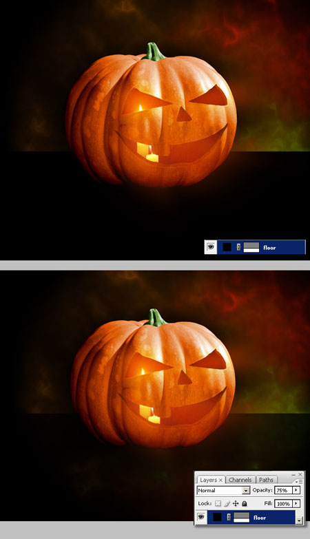 Шаг 29. Осталось создать отражение для тыквы. Поместите все слои с тыквой в группу, дублируйте и создайте отражение как в шаге 28.