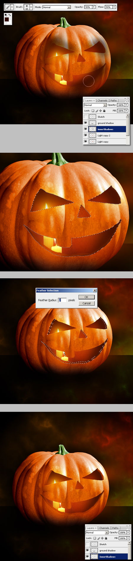 Шаг 8. Загрузите выделение слоя «заливка» (Ctrl+клик по миниатюре слоя), перейдите на слой «тыква» и нажмите Delete, расположите слои, как показано ниже.