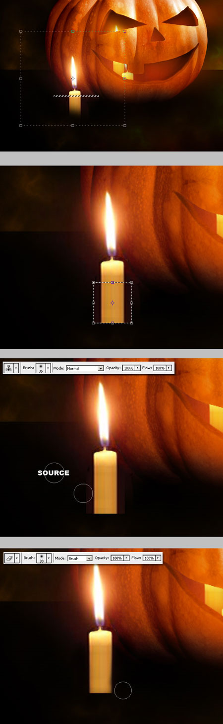 (Clone Tool), клонируйте источник со свечки, установите маленький размер кисти и нарисуйте потёки воска. Далее, используя инструмент «Палец»