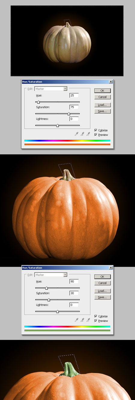 (Lasso Tool), выделите веточку тыквы, инвертируйте выделение (Shift+Ctrl+I), (т. к. сейчас мы будем изменять цвет только тыкве). Далее, поменяем цвет на оранжевый (Ctrl+U), настройки ниже, поставьте галочку Тонирование (Colorize). Инвертируйте выделение снова (Shift+Ctrl+I) и изменим оттенок веточки на зелёный (Ctrl+U), настройки ниже, поставьте галочку Тонирование (Colorize).