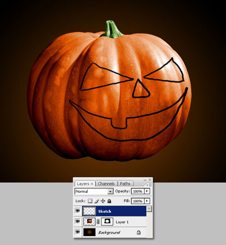 Шаг 5. Приступим к созданию лица нашей тыкве. Создайте новый слой, назовите «эскиз», нарисуйте инструментом «Кисть»