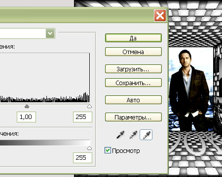 Пипеткой с черным концом один раз нажмите в самом темном месте фотографии (у меня это волосы). Пипеткой с белым концом один раз нажмите в самом светлом месте фотографии (у меня это фон).