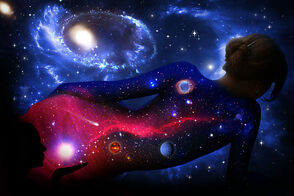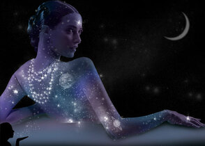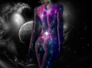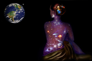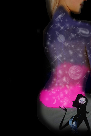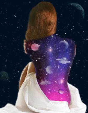 Шаг 12. Я еще вернулась к слою с лежащей девушкой и поставила ей такие настройки: Яркость: -23, Контрастность: -25, Насыщенность: +24. Поиграйте также с цветовым балансом. Я также добавила планет. Вот что у нас в итоге получилось: (рис.16) Фантазируйте! В данном случае холстом может служить не только спина! Удачи!