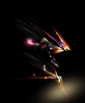 Шаг 9. Теперь человек выглядит так, как будто он и вправду там находится. Теперь можно приступить к световым эффектам. Автор выбрал для работы это изображение. Перетащите изображение в главный проект поверх всех слоев, иначе корректирующие слои наложат свои эффекты на абстракцию, и измените Режим наложения на Linear Dodge (Линейный осветлитель). С помощью Burn Tool