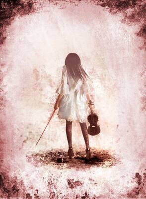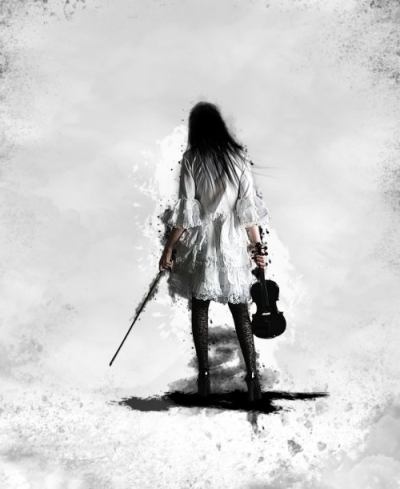 Добавим несколько тёмных мазков кистью вокруг скрипки, смычка и рук девушки.