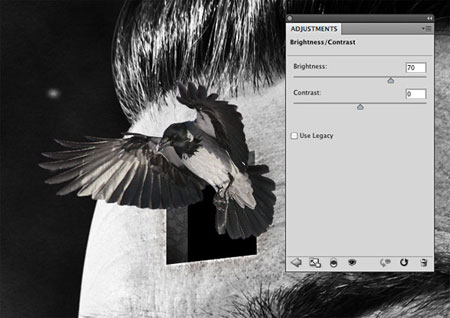 Смотрите, изображение с вороной слишком темное и нашу птицу почти не видно. Для того, чтобы осветлить содержимое этого слоя, зайдите в Image > Adjustments > Brightness/ Contrast (изображение – коррекция – яркость/ контрастность) и увеличьте яркость до 70. Вот сейчас уже лучше: