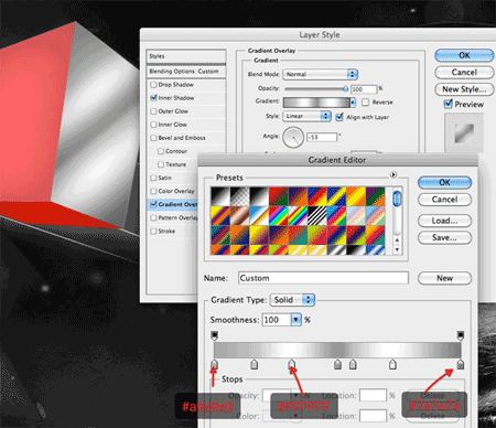 Добавьте следующие стили слоя. Обратите внимание, единственное, что вам придется изменить – это угол градиента. Внимательно посмотрите, какие настройки выставил я: