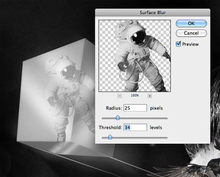 Уменьшите прозрачность всех 3 слоев. В конце, примените еще один фильтр к слою с астронавтом. Зайдите в Filter > Blur > Surface blur (фильтр – размытие – поверхностное размытие) и поставьте такие настройки: