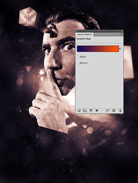 Зайдите в Layers > New adjustment layers > Gradient Map (слой – коррекция – карта градиента) и добавьте градиент от синего (#13055c) к оранжевому (#ff5400). Установите прозрачность на 50%.