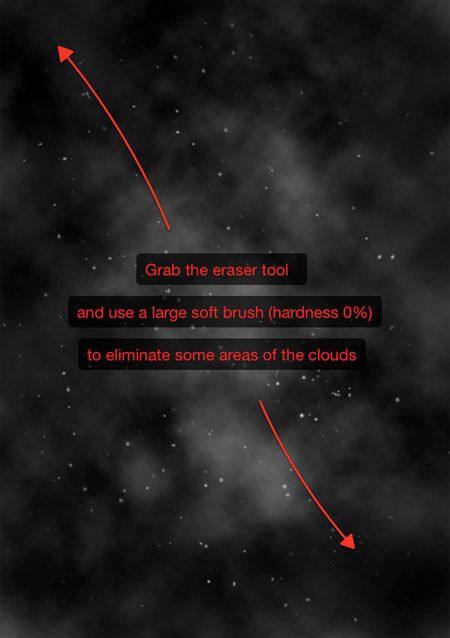 Теперь давайте добавим облака. Откройте новый слой и зайдите в Filter > Render > Clouds ( фильтр – рендеринг – облака). Измените режим наложения на Screen ( осветление). Чтобы удалить черные зоны, уменьшите прозрачность до 30% и, с помощью erase tool