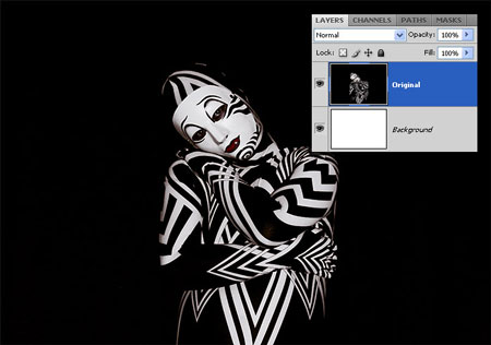 Шаг 3. Убедитесь, что фон полностью залит черным цветом (работаем все еще на копии слоя "оригинальный"). Используя заливку, кисти и выделение, заполняем весь фон черным. Корректируем области, отмеченные на скриншоте.