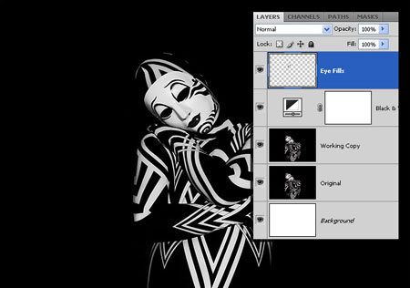 Шаг 9. Возвращаемся на основной документ. Создаем корректирующий слой Layer - New Adjustment Layer - Black&White (Слой - Новый корректирующий слой - Черно-белый), затем создаем новый слой "заливка глаз". Заливаем глаза модели черным цветом.