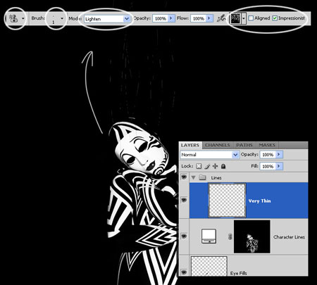 (Текстурный штамп) (S). В параметрах этого инструмента выбираем текстуру, которую мы создали. Mode (Режим) устанавливаем на Lighten (Замена светлым) и активируем опцию Impressionist (Импрессионист). Используя мягкую кисть размером 1px, рисуем линии над головой будущего робота.