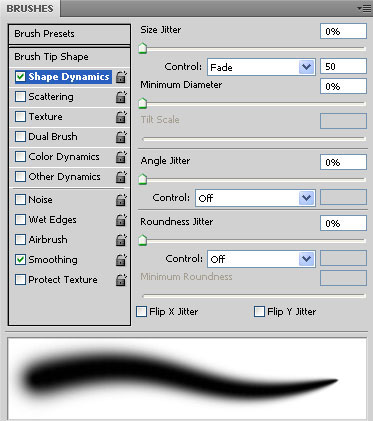 А именно изменив в Shape Dynamics (Динамика формы) функцию Control (Управление) под SizeJitter (Колебание размера) на Fade (Переход), тем самым установив плавность перехода и сделав отпечаток кисти плавно исчезающим.