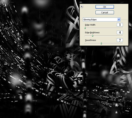 Шаг 17. Работая с абстрактным фоном, у автора была идея того, чтобы линии с абстрактным рисунком исходили со всех сторон, в том числе и со стороны зрителя. Чтобы получить необходимый для этих линий расфокусированный эффект, автор снова использовал Pattern Stamp Tool