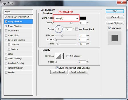 Нажмите окошко «Добавить стиль слоя» (Add a layer style) в нижней панели инструментов и выберете «Тень» (Drop Shadow).