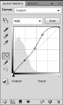 Ещё раз нажмите окошко «Новый корректирующий слой» (New adjustment layer) в нижней панели инструментов (Layers panel), выберете «Кривые» (Curves) проведите небольшую коррекцию цвета как показано на рисунке для увеличения контраста.