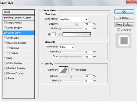 Добавим стиль слоя (Add a layer style) Внешнее свечение (OuterGlow)
