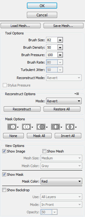 Применяем фильтр Liquify (Пластика) (SHIFT+CTRL+X) с такими параметрами: