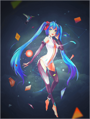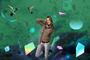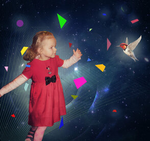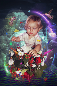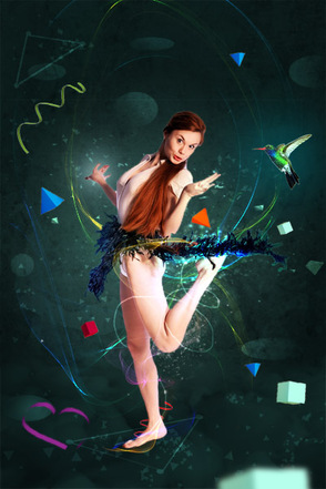 Далее, вы можете добавить птичку колибри. Я использовал Цветовой Тон / Насыщенность (Hue/Saturation), для того чтобы поменять цвета на более интересные оттенки и добавил внешнего свечения за счёт режима наложения Осветление Основы (Color Dodge).