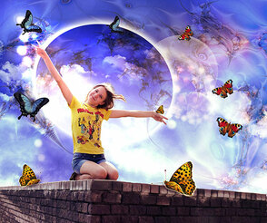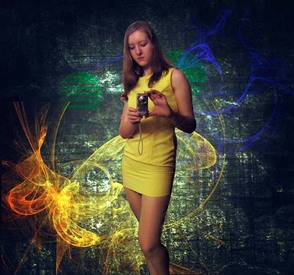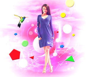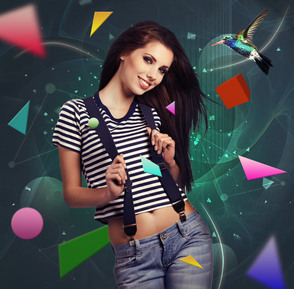 ШАГ 6. Добавьте изображение фрактала и переместите на наш документ, расположите слой с изображением фрактала поверх слоёв с девушкой (или ниже, если хотите) и поменяйте режим наложения слоя с фракталами Осветление Основы (Color Dodge). Создайте слой- маску к этому слою и мягкой кистью скройте часть изображения, как на скриншоте ниже. Вы можете также поменять Цветовой тон (Hue), если вы захотите получить различные цветовые оттенки.